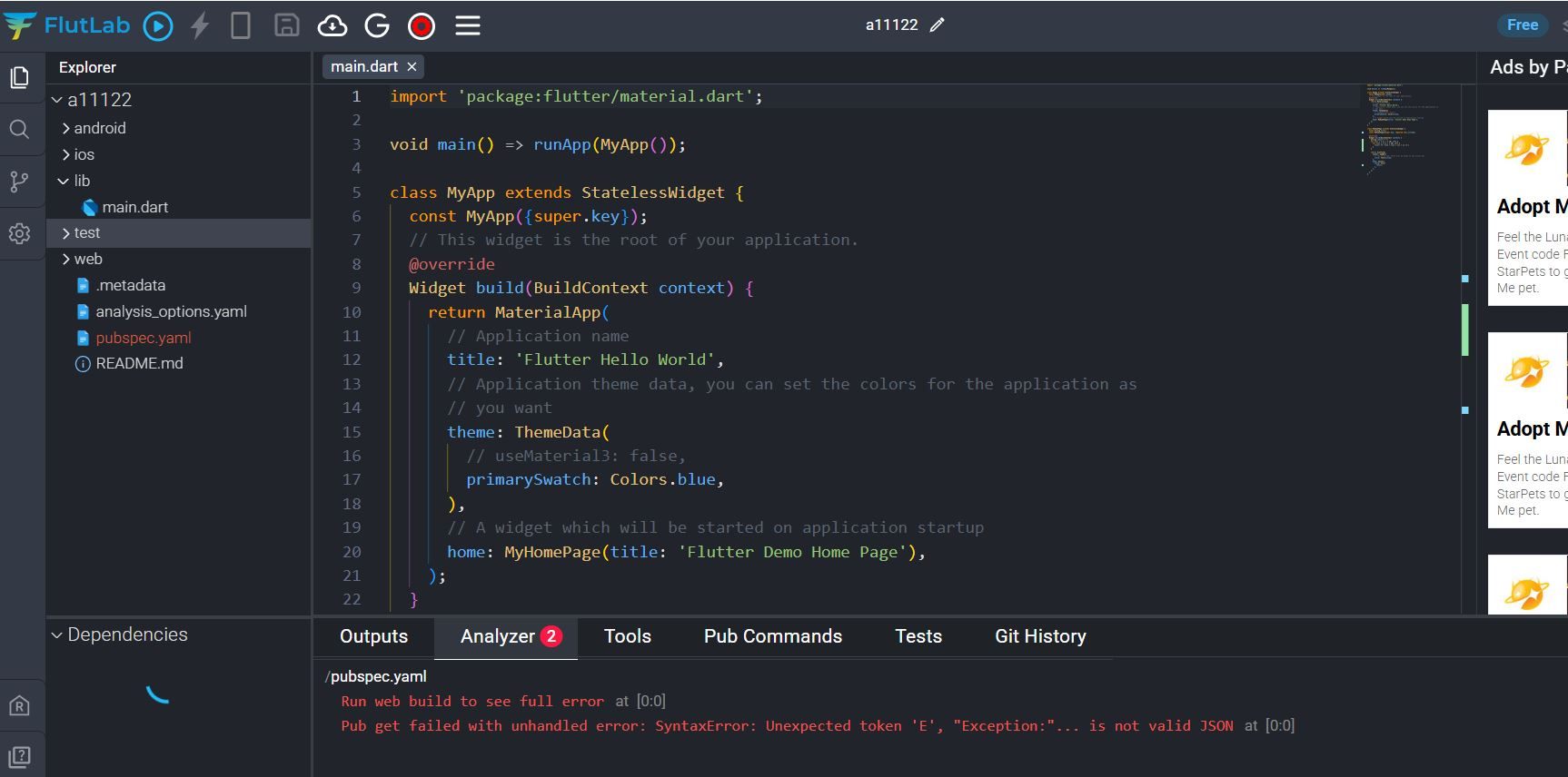 Hello, how do I solve this? /pubspec.yaml Run web build to see full error at [0:0] Pub get failed with unhandled error: SyntaxError: Unexpected token 'E', "Exception:"... is not valid JSON at [0:0] I already tried updating pubspec.yaml